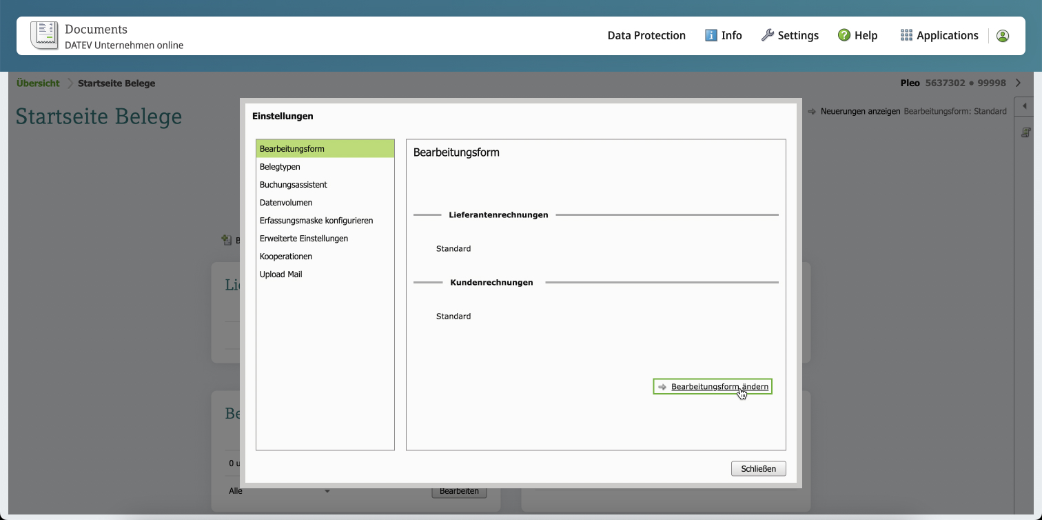 For Pleo to successfully import Invoices into DATEV Unternehmen Online (DUO), including the invoice & bookkeeping information, your company’s DATEV account Bearbeitungsform must be set to Erweitert.