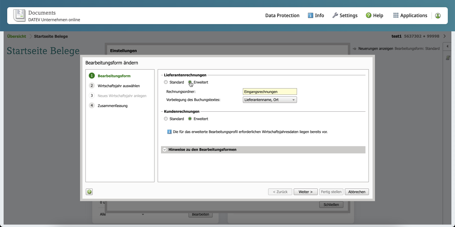 Changing to Bearbeitungsform Erweitert in DATEV Unternehmen online and creating a fiscal year