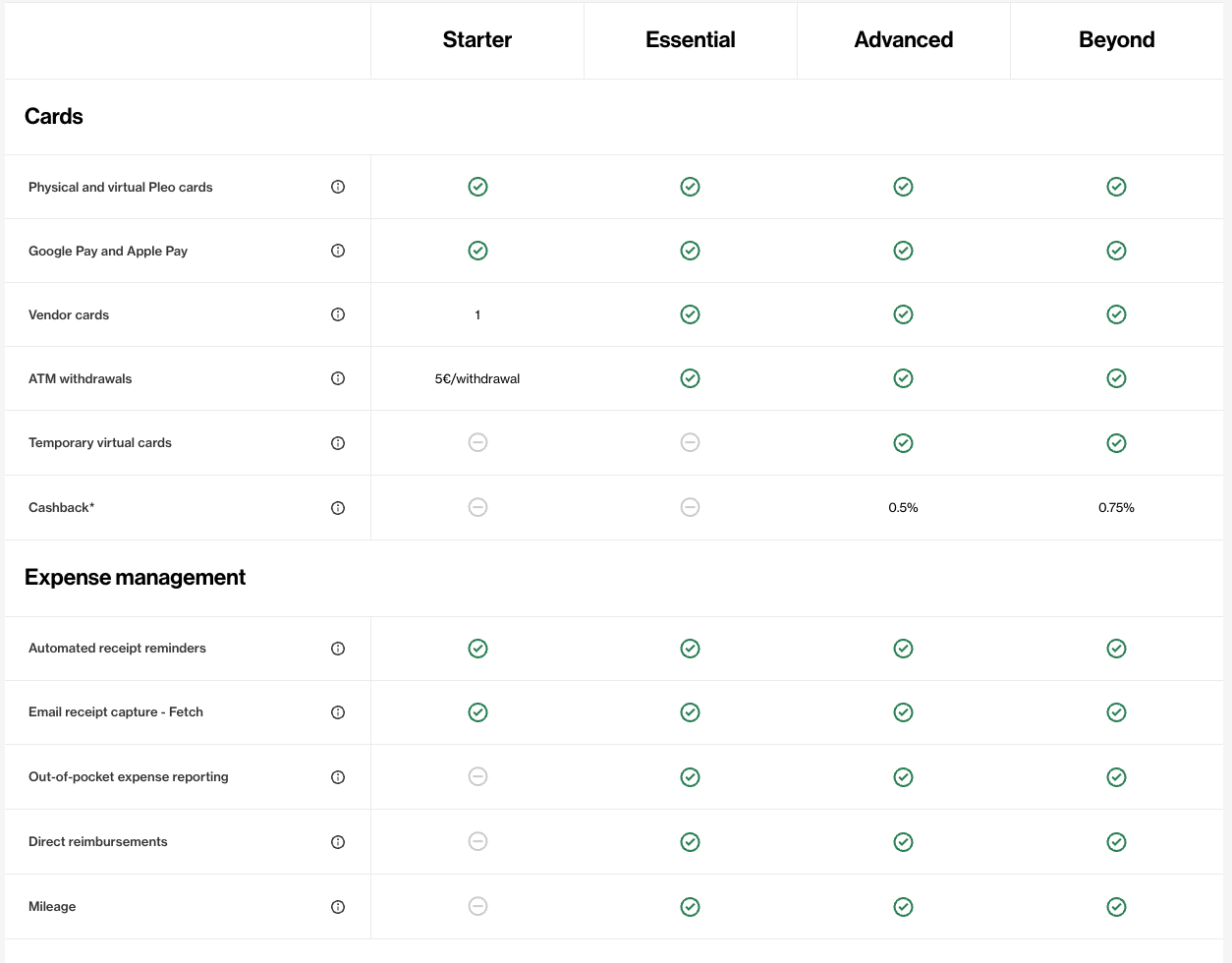 ✓ Pleo company cards (plastic/virtual) | ✓ Reimbursements | ✓ 0.5% cashback (for eligible customers) | ✓ 0.75% cashback (for eligible customers) |