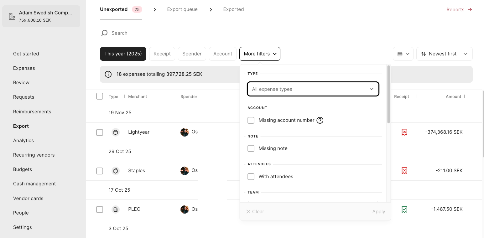 On the Export page, admins and bookkeepers will be able to export the expenses through an integrated accounting system or a custom export.